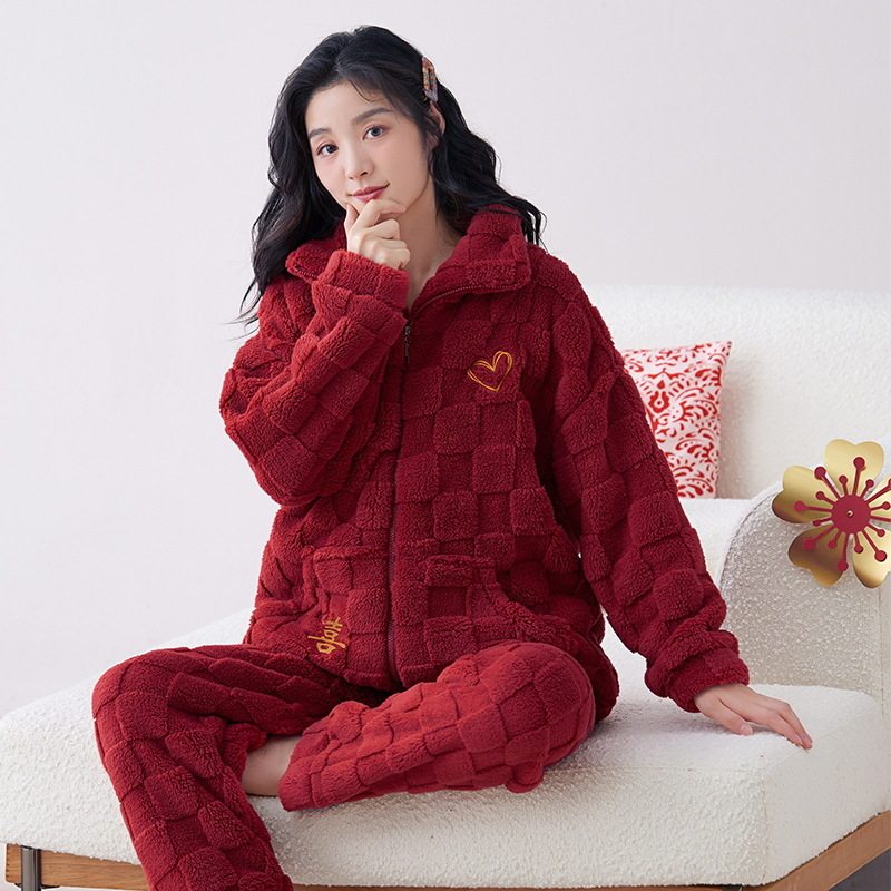 睡衣女春秋款珊瑚绒秋冬加厚加绒红色本命年冬季薄款法兰绒家居服