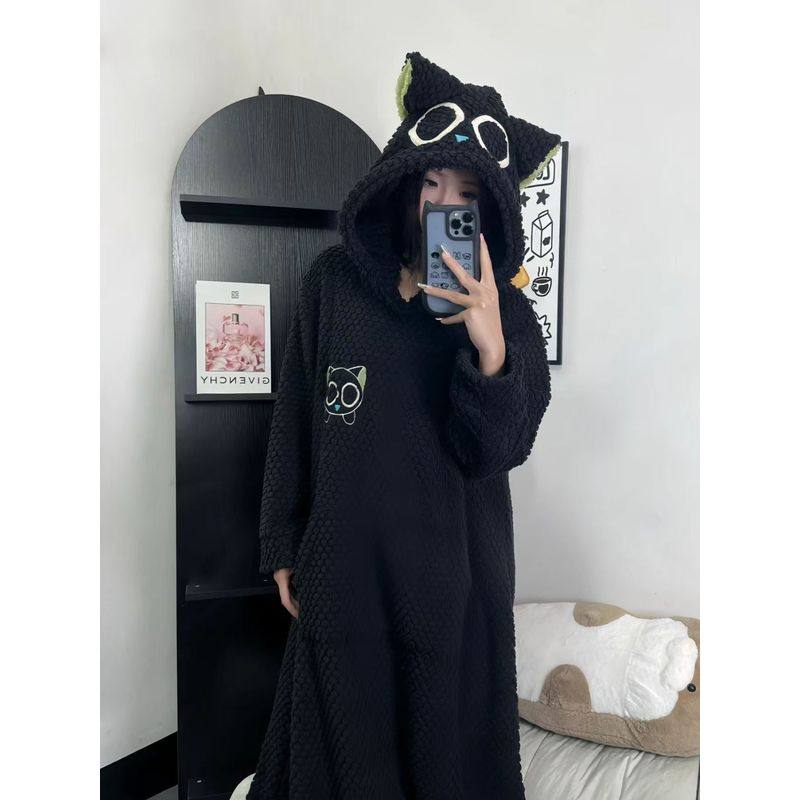 yso【酷猫系列】睡衣女冬季加厚毛绒长款可爱猫耳睡袍保暖家居服D