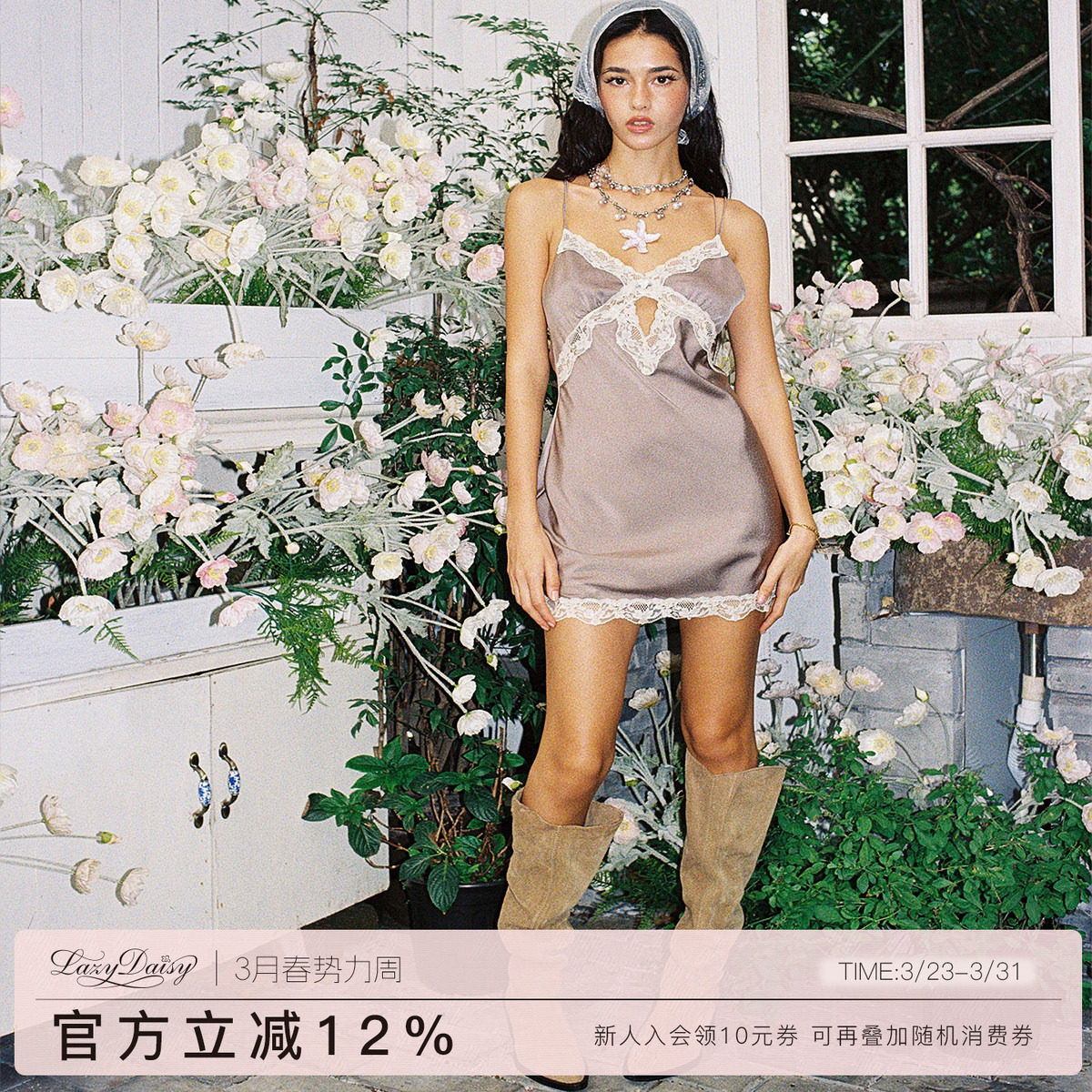 Lazy Daisy Katrina系列 珠绣蕾丝拼接棕褐色交叉露背吊带短睡裙