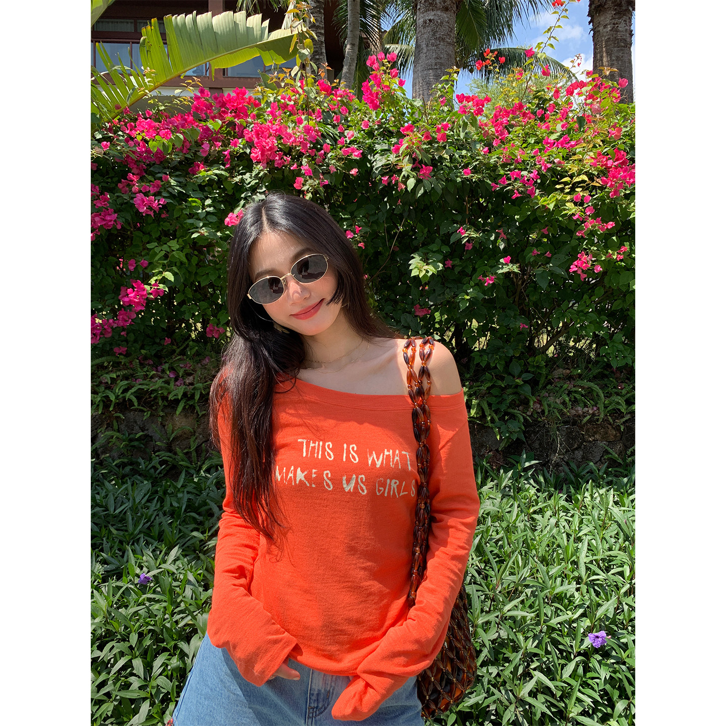落落狷介 2026超火减龄上衣chic早春长袖一字肩T恤女显瘦斜领橘色