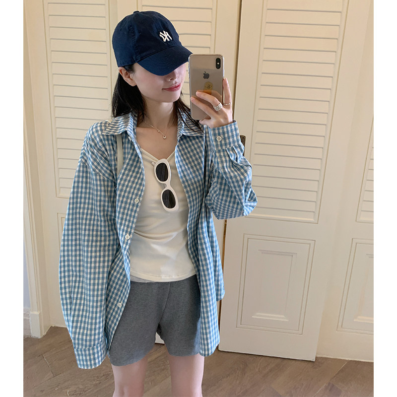 金苏一 蓝格子衬衫2026春夏韩版宽松长袖防晒薄款外套chic上衣潮