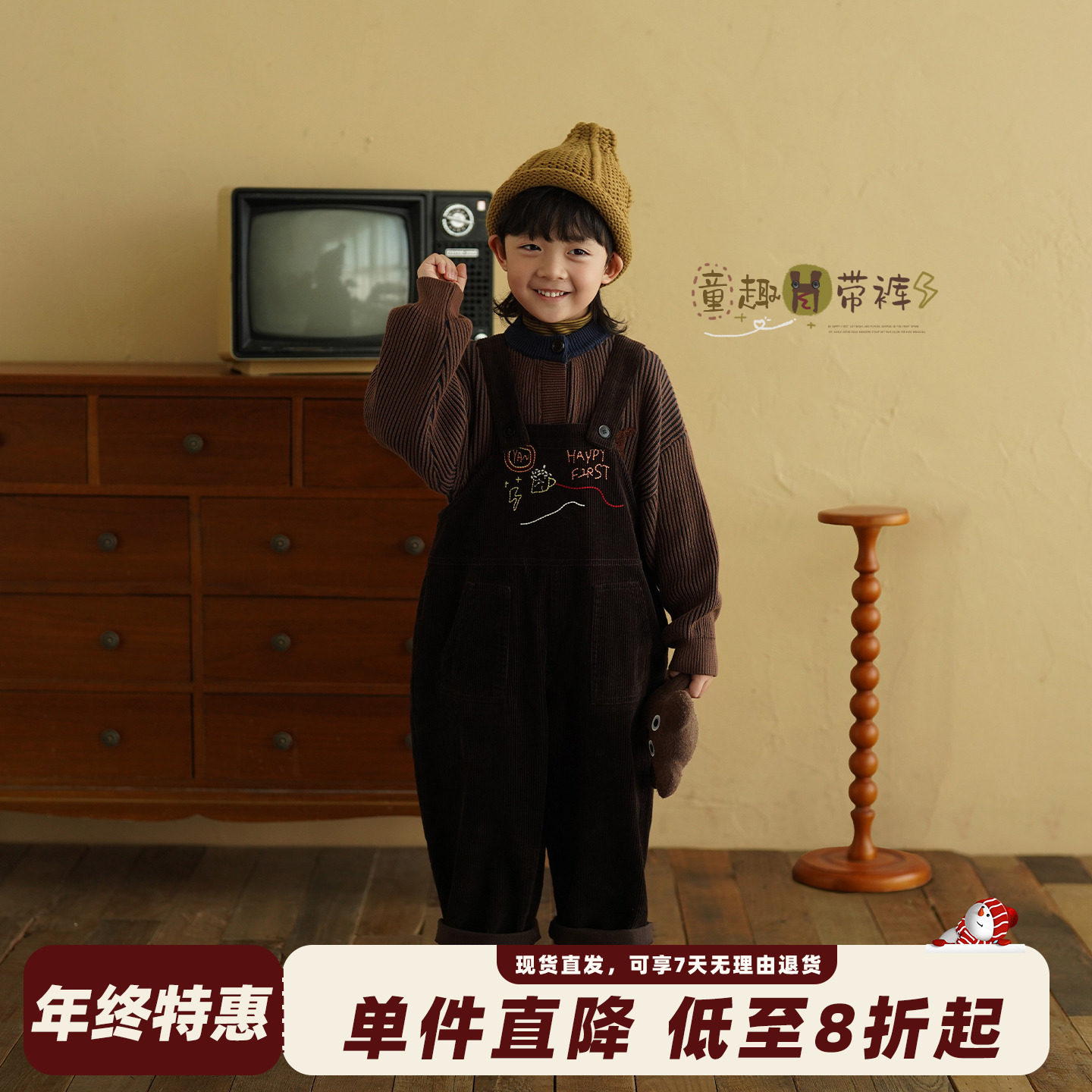 砚台家童装全棉灯芯绒背带裤秋冬款男童咖色长裤子儿童宽松直筒裤