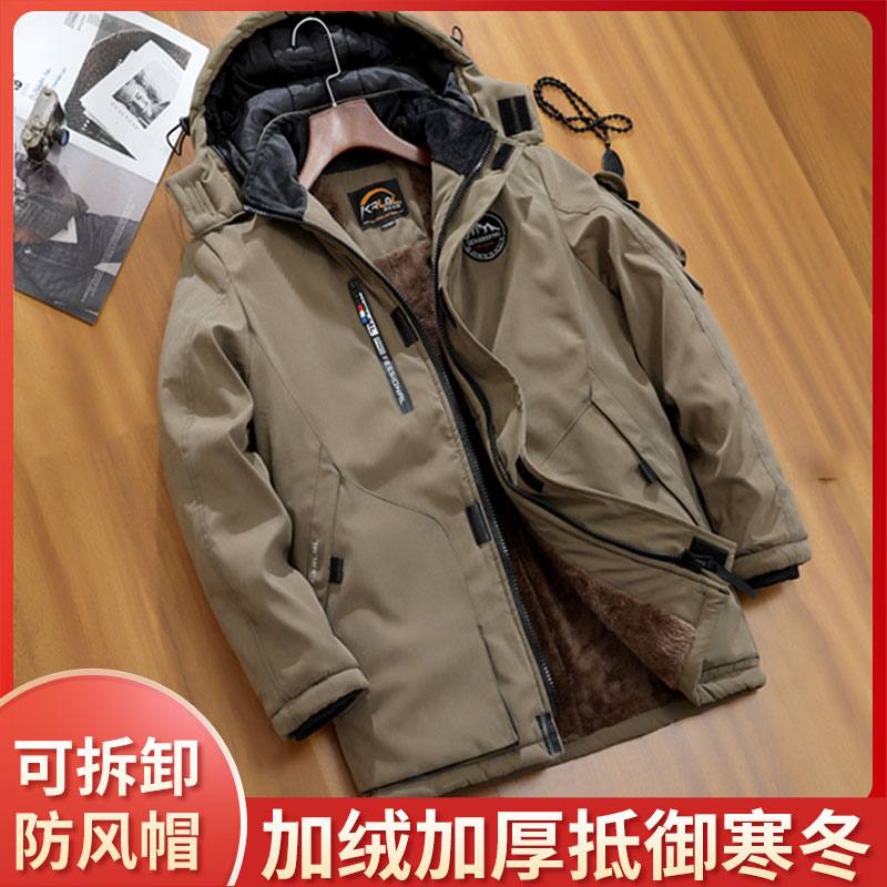 秋冬季加绒加厚棉衣外套男中长款防寒保暖棉袄连帽休闲棉服风衣男