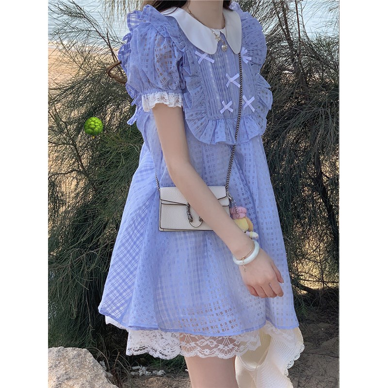 大码女装夏季胖mm娃娃领蕾丝边甜美可爱蓝色格纹公主蓬蓬裙连衣裙
