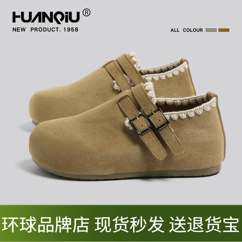 勃肯鞋加绒圆头博肯鞋女一脚蹬单鞋懒人真皮毛毛鞋包头拖鞋女外穿