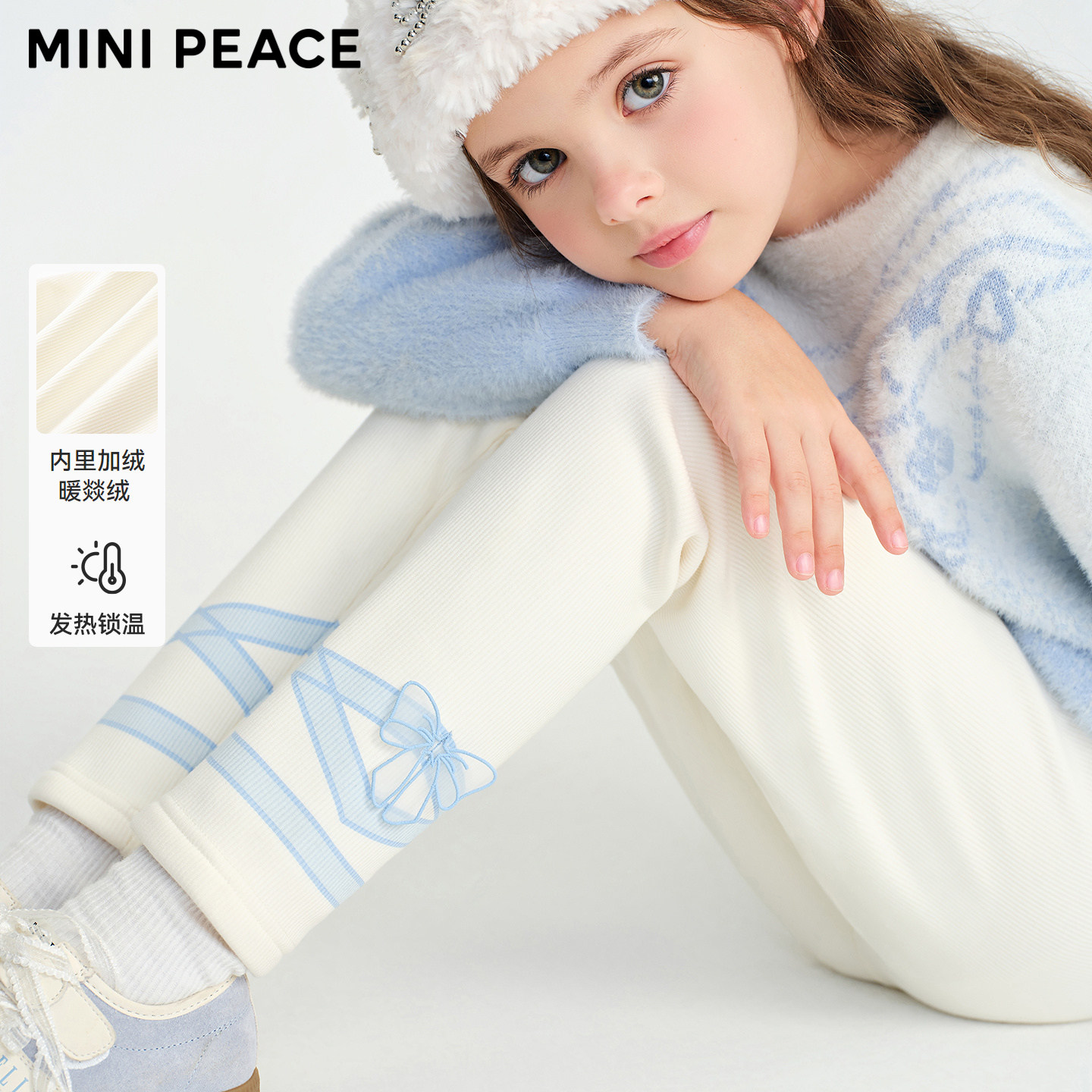 MINIPEACE太平鸟童装儿童打底裤加绒冬季白色蝴蝶结丝带女童裤子