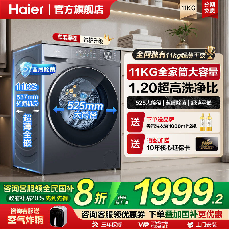 海尔滚筒洗衣机大容量11公斤kg超薄全自动58E家用洗烘官方旗舰店