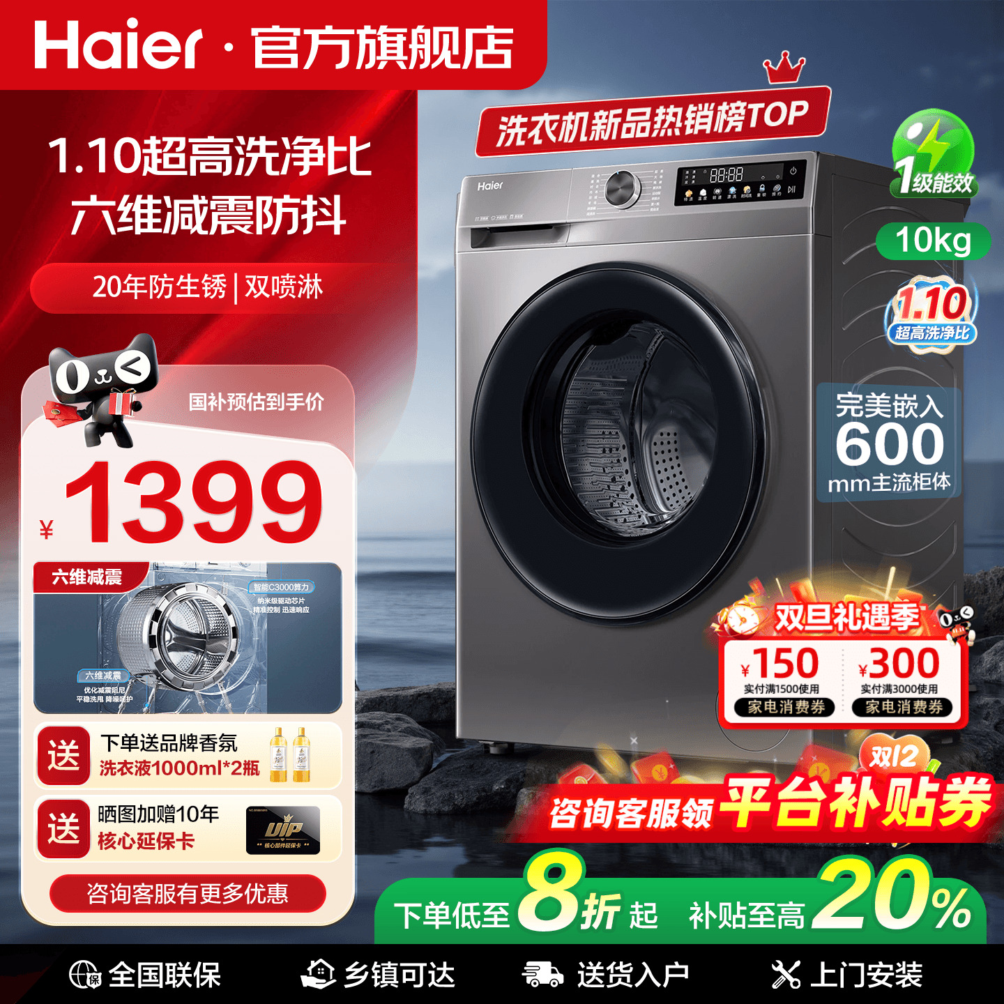 海尔洗衣机洗烘干一体机家用全自动10公斤超薄嵌入大容量变频滚筒