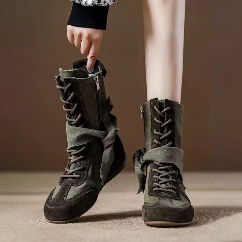西班牙小众品牌橄榄绿牛仔靴女中筒帆布马丁靴薄款透气短靴女超火