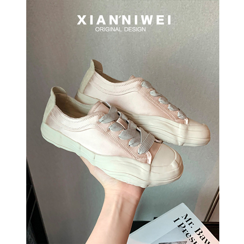 新品PG西班牙小众真丝做旧绸缎内增高厚底松糕小白鞋女鞋子四季鞋