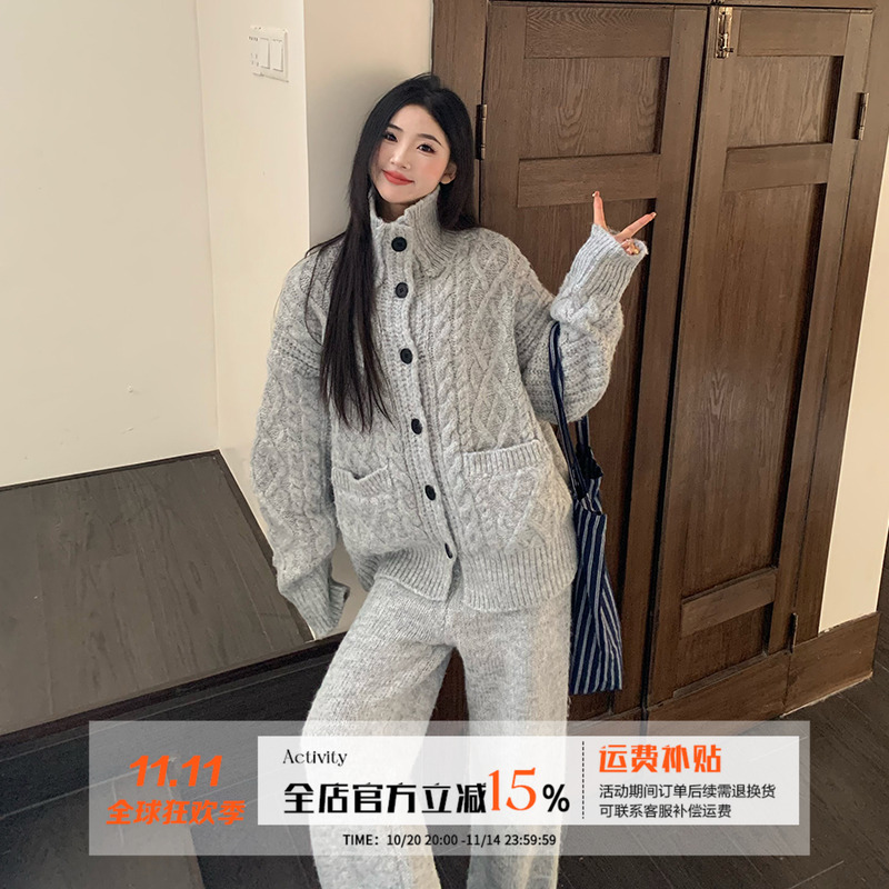 橘子树在哪儿韩系毛衣套装女秋冬慵懒风显瘦针织开衫阔腿裤两件套