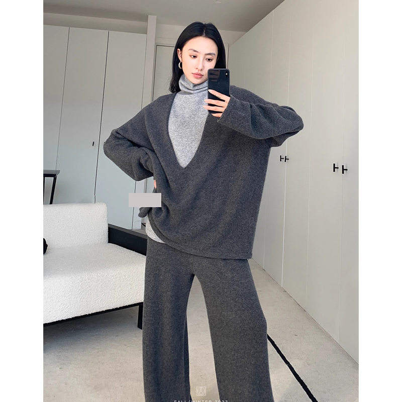 简约叠穿~row风羊绒深V领毛衣阔腿裤撞色叠穿针织上衣时尚套装