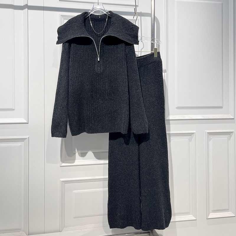 时尚百搭翻领毛衣高腰阔腿裤女2025秋季新款别致舒适显高显瘦套装