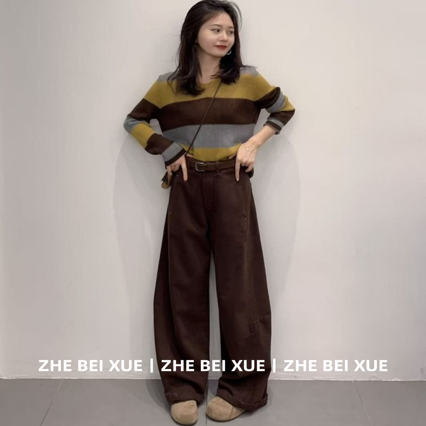 秋冬美式复古毛衣外套慵懒圆领针织衫内搭上衣高腰宽松阔腿裤套装