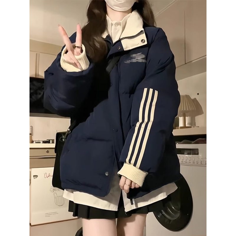 冬季新款美式甜美拼色条纹刺绣棉服女学生宽松立领加厚保暖面包服