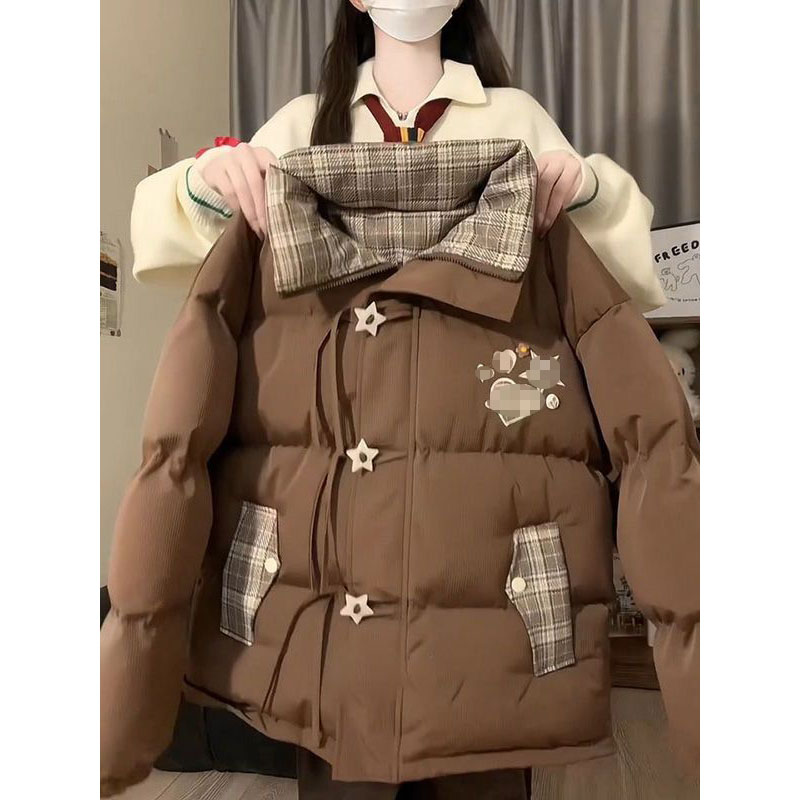 格子加厚羽绒棉服女冬季2025新款立领韩系呢子面包服学生棉袄外套