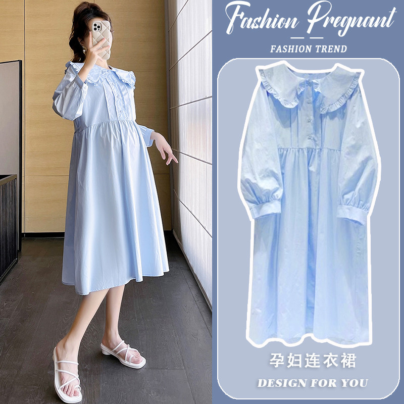 孕妇连衣裙2026新款春秋天蓝色娃娃领时尚宽松显瘦遮肚气质打底裙