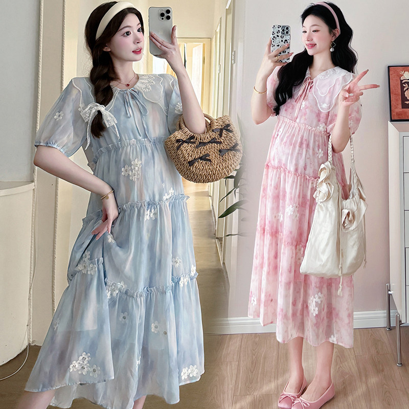孕妇装夏装设计感娃娃领短袖连衣裙时尚花朵刺绣裙子夏季孕妇裙夏