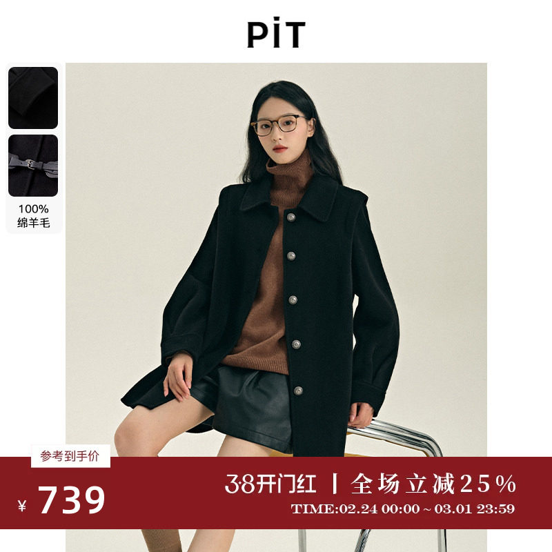 PIT100%绵羊毛呢外套女2025冬季新款长款大衣黑色百搭显瘦