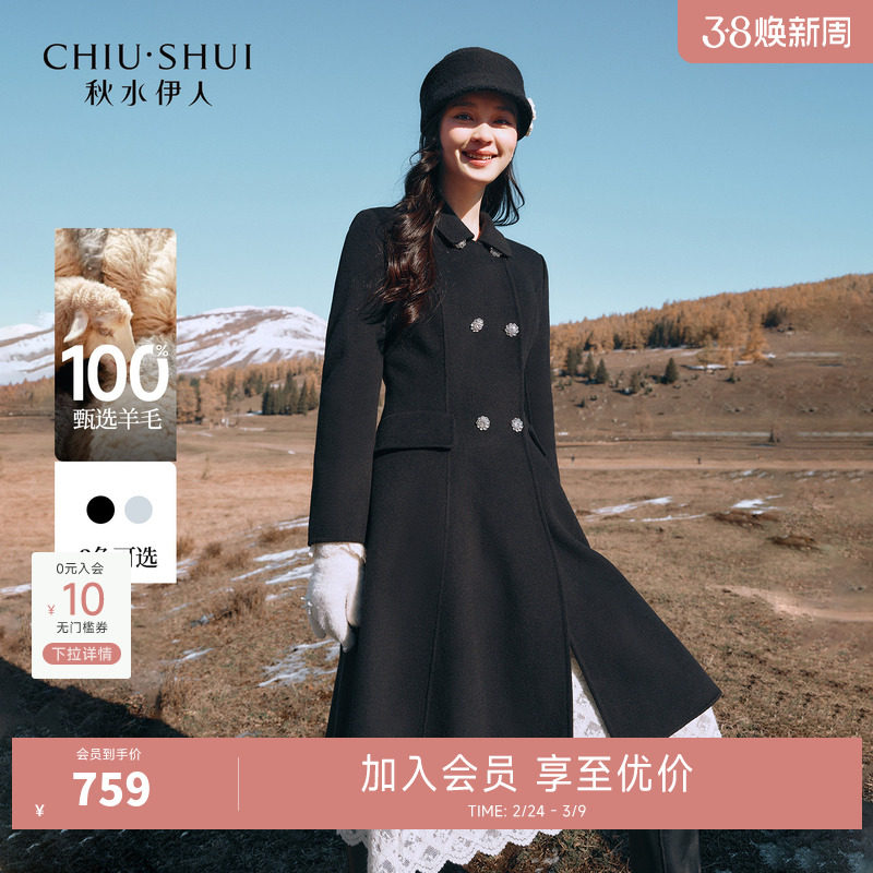 秋水伊人黑色呢子大衣绵羊毛中长款毛呢外套冬季新款女装修身上衣