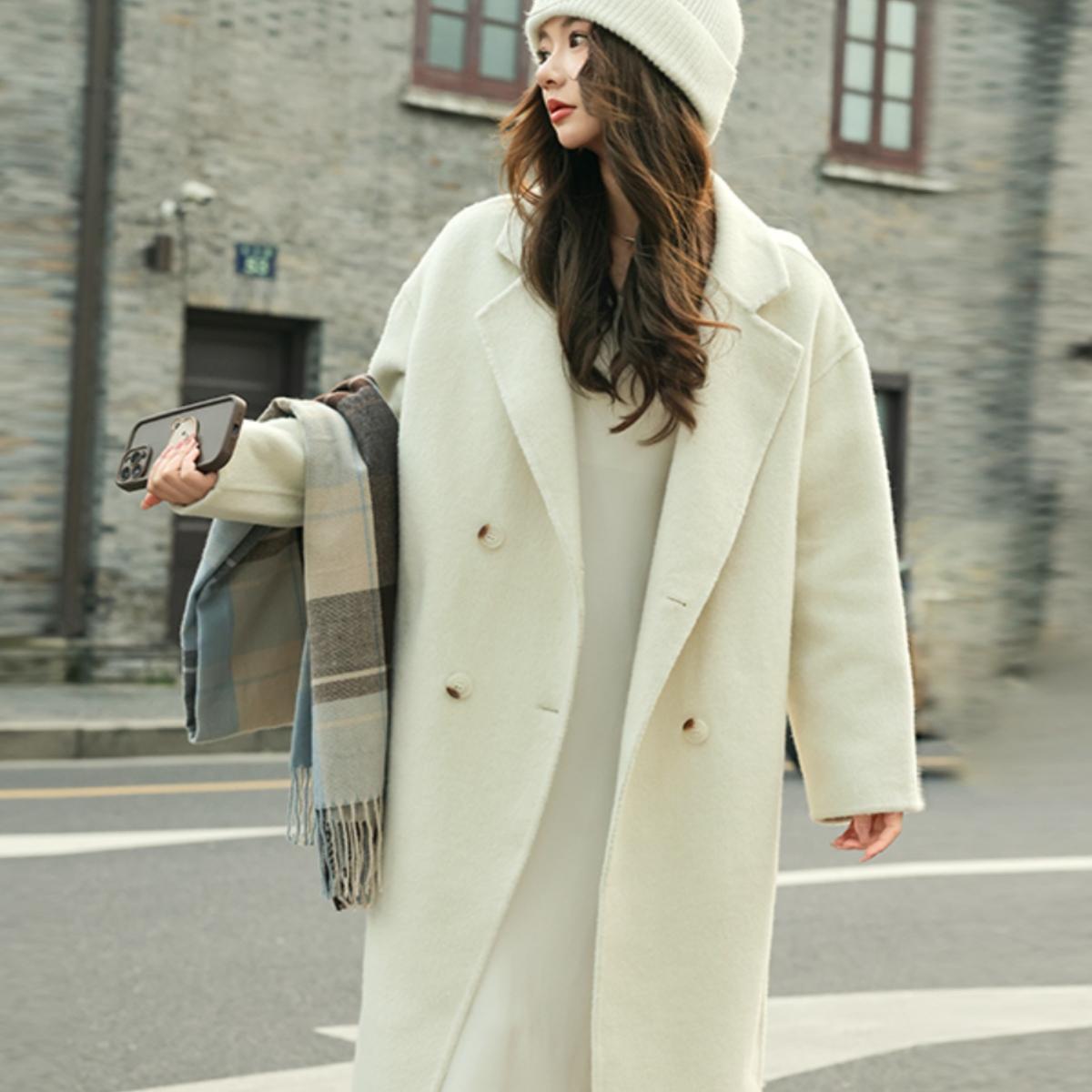 - 女士白色毛呢大衣中长款