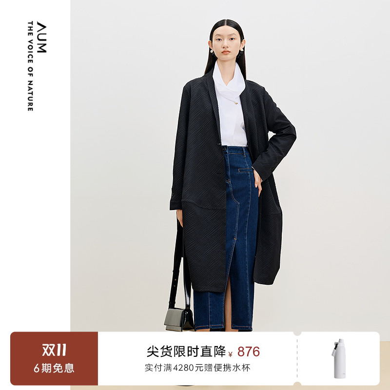 【商场同款】AUM噢姆秋季宽松提花茧型设计感大衣中长款黑色外套