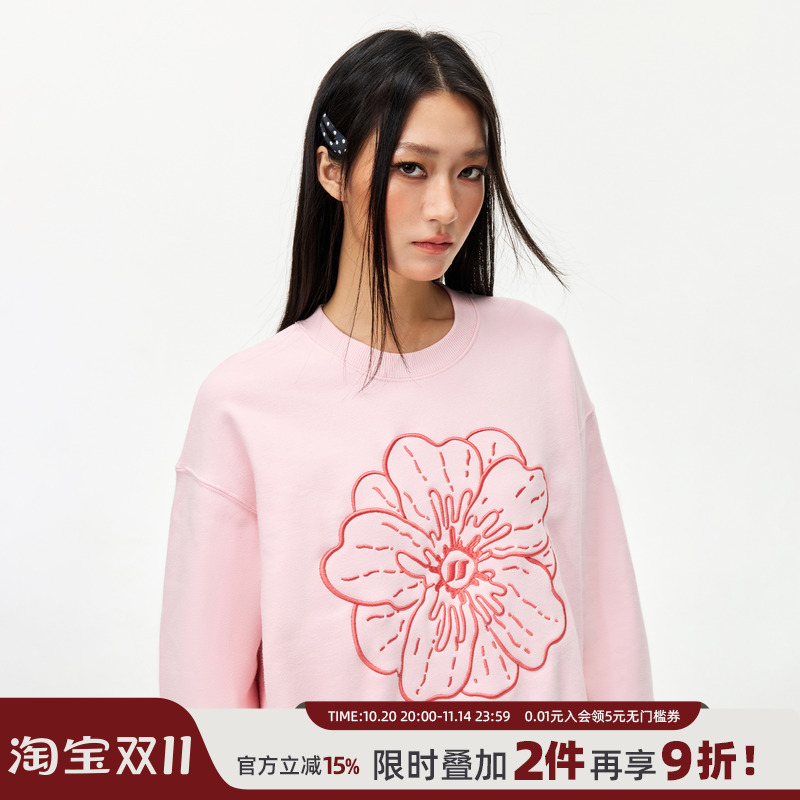 丛林老虎花卉刺绣重磅粉色卫衣女高街潮牌宽松休闲圆领套头上衣男