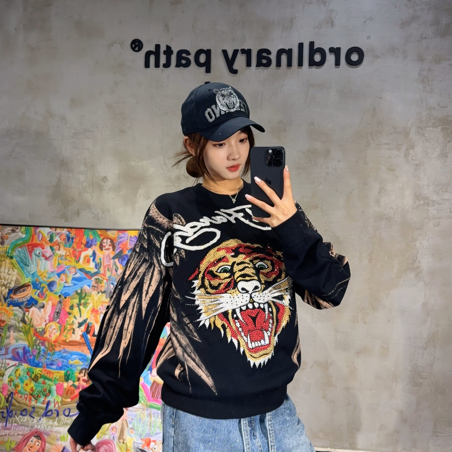 轻奢潮牌烫钻经典美式老虎头男女套头衫潮流带钻闪耀上衣痞帅卫衣