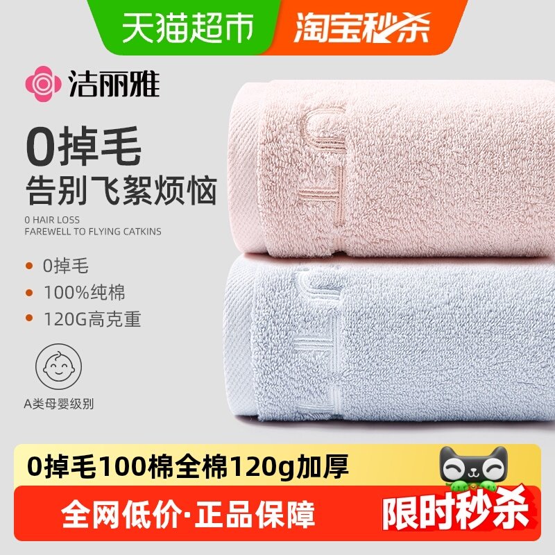 洁丽雅毛巾纯棉洗脸家用成人不易掉毛柔软全棉吸水抗菌面巾女2条