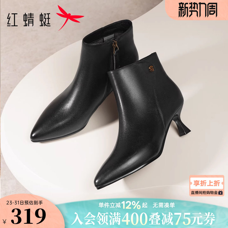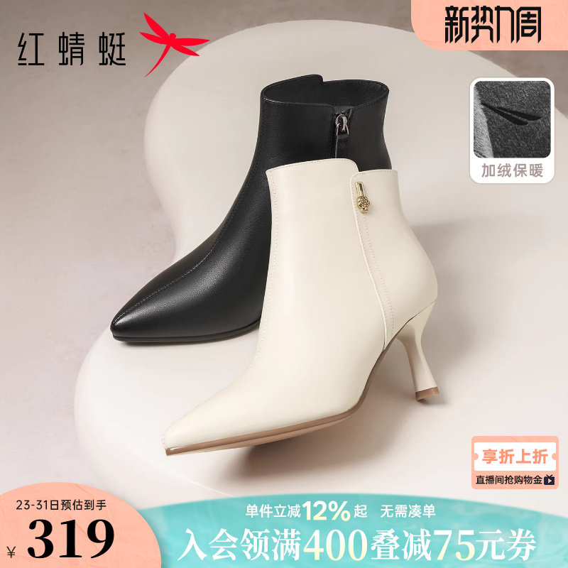 红蜻蜓高跟鞋冬季新款女鞋靴子细跟女士鞋子真皮白色尖头皮鞋女靴