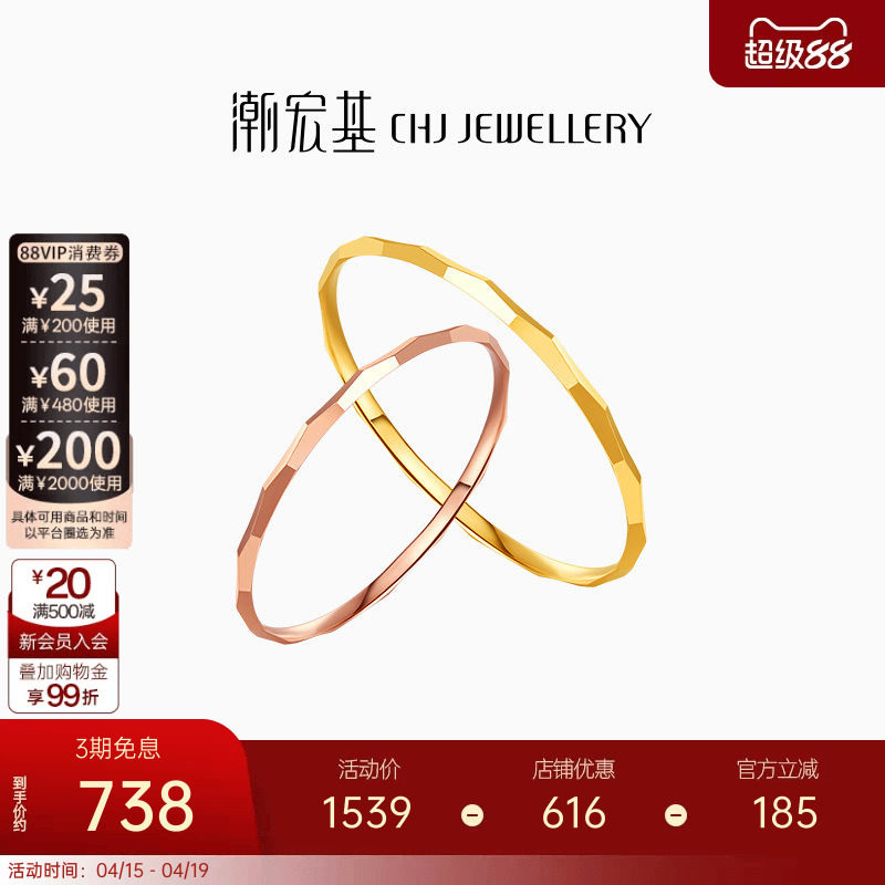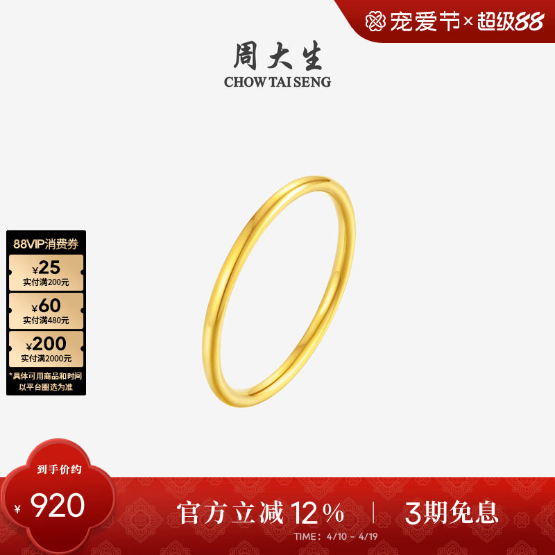 周大生黄18K金戒指女素圈戒圈爆闪指环简约尾戒生日礼物送女友