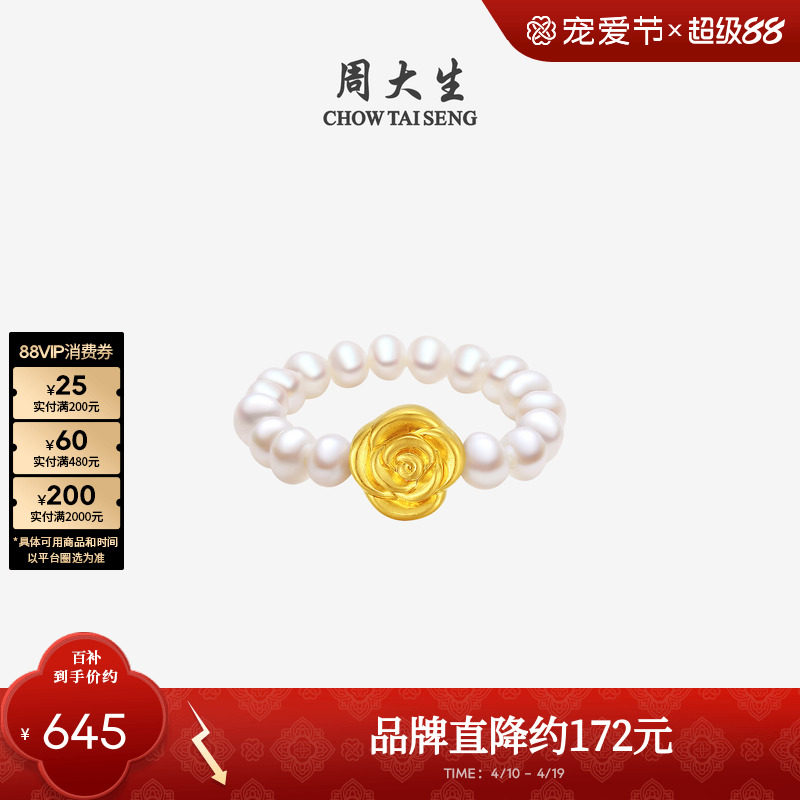 周大生珍珠戒指黄金玫瑰花蝴蝶结指环足金硬金戒圈尾戒母亲节礼物