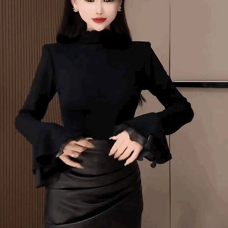 法式喇叭袖小香风洋气T恤打底衫女黑色高领内搭上衣欧货德绒保暖