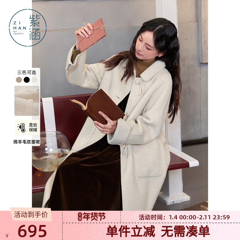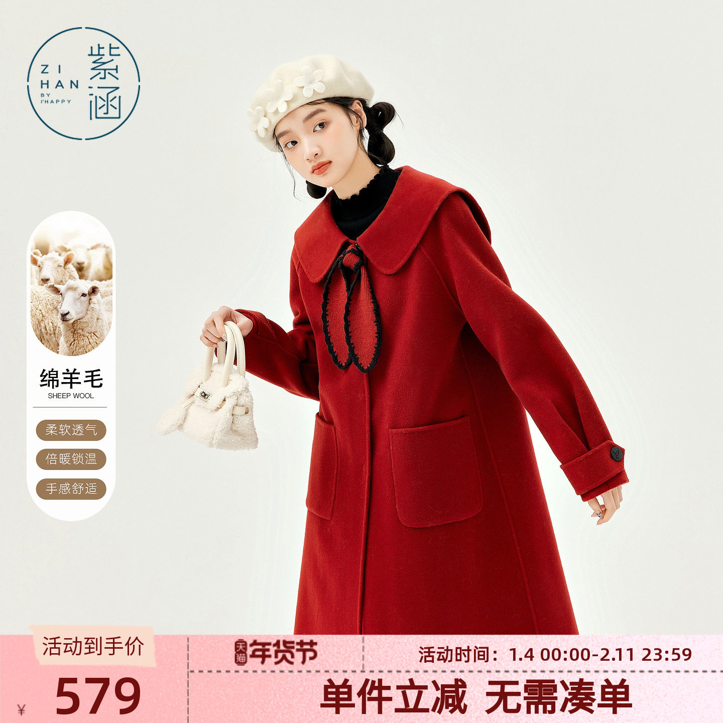 紫涵大翻领双面羊毛呢大衣女冬季新款甜美可爱宽松纯色长款呢外套