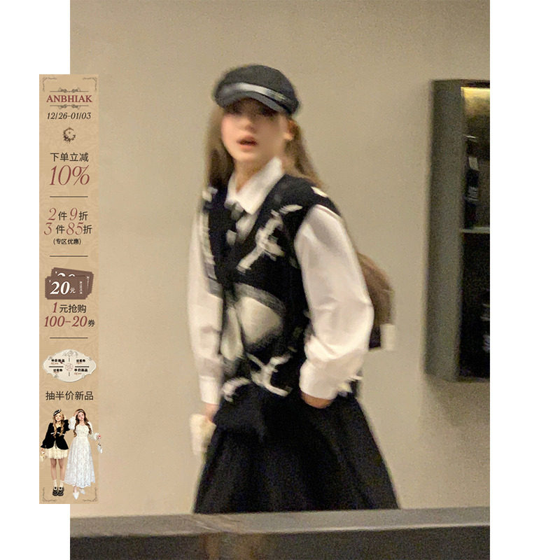 安妮不火 学院风显瘦套装女2025秋冬新款微胖大码黑白马甲针织衫
