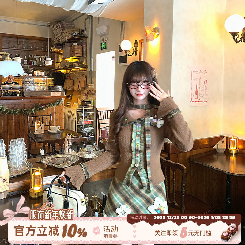 织物猪 可可松露 甜美风套装毛针织开衫上衣女秋冬格纹绣花长裙子