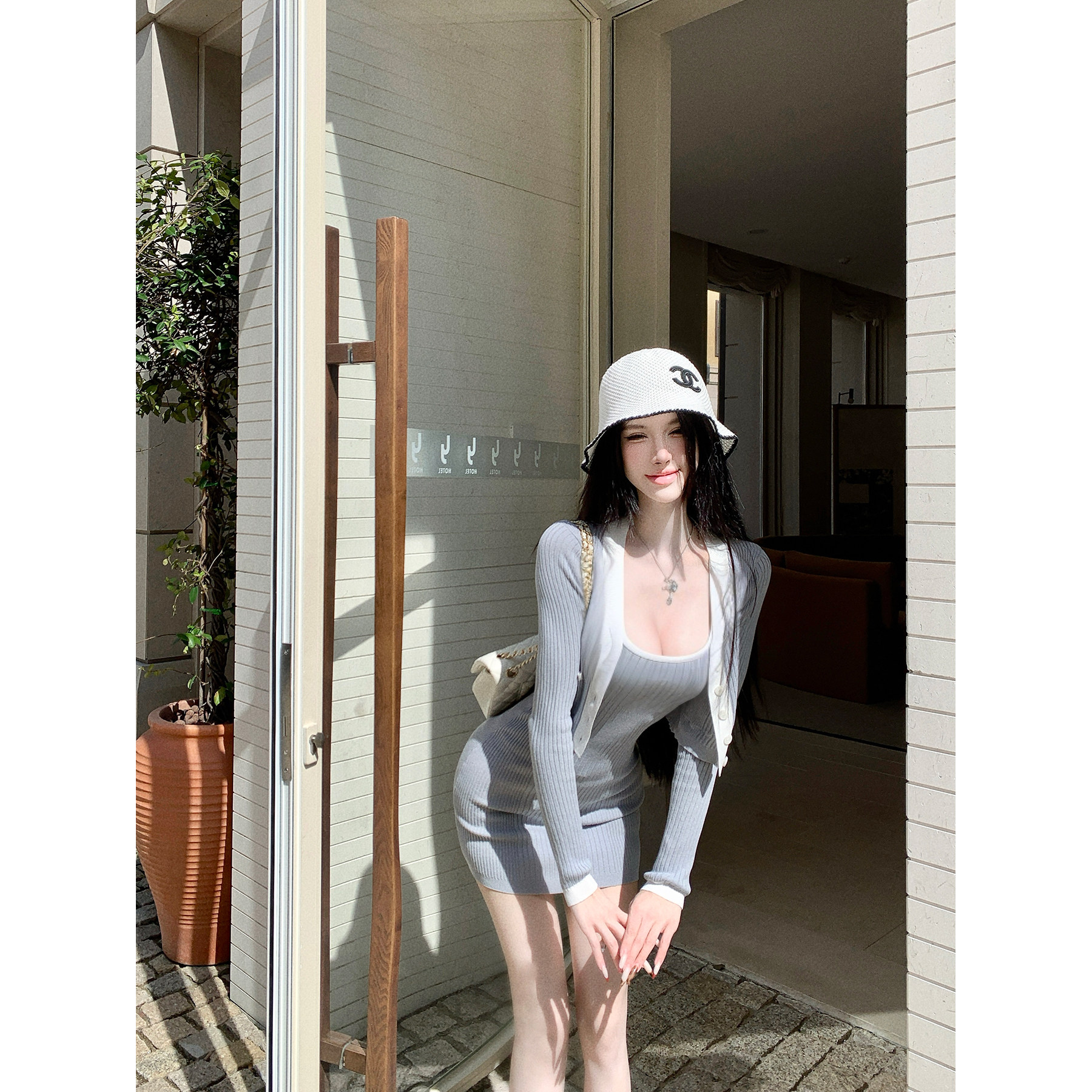 【现货】灰尘邓邓 针织开衫连衣裙套装女秋季性感包臀裙吊带裙子