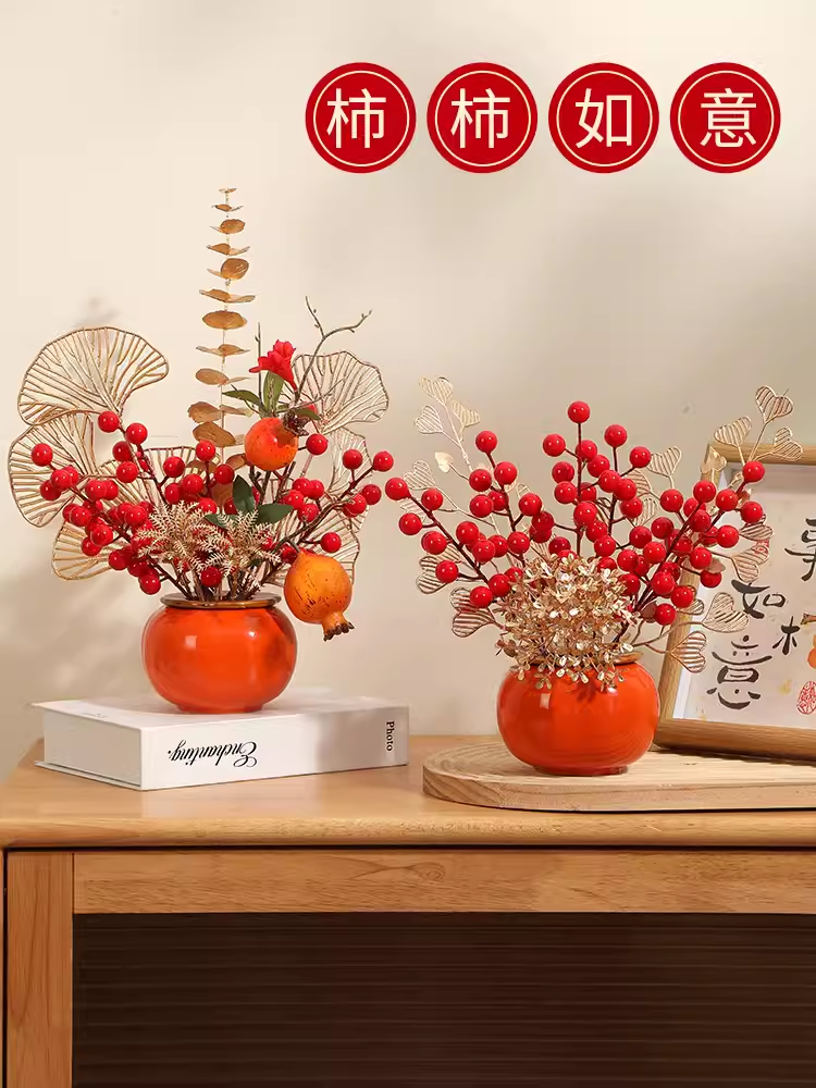 柿柿如意仿真花摆件柿子绿植假花客厅插花摆设新年家居花瓶装饰品