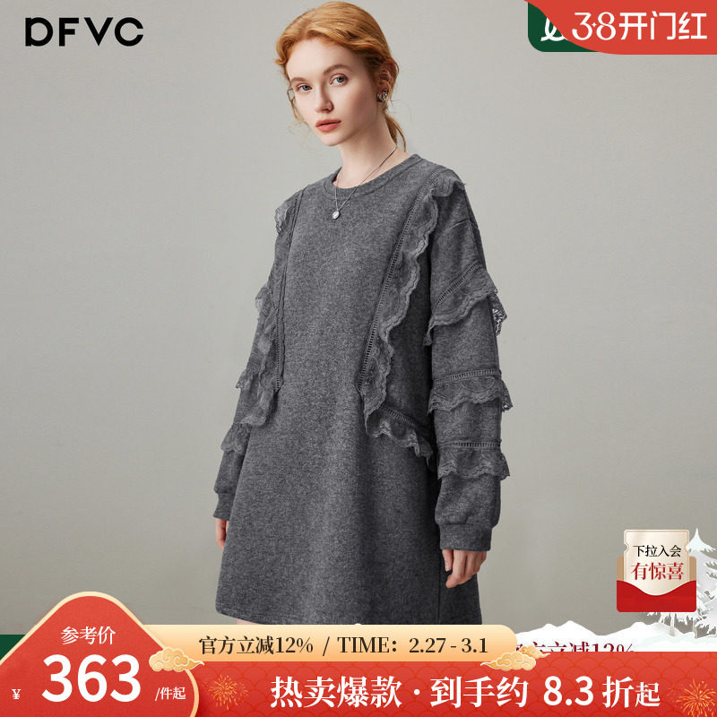 dfvc时尚休闲圆领卫衣裙女2025年冬季新款蕾丝花边宽松冬装连衣裙