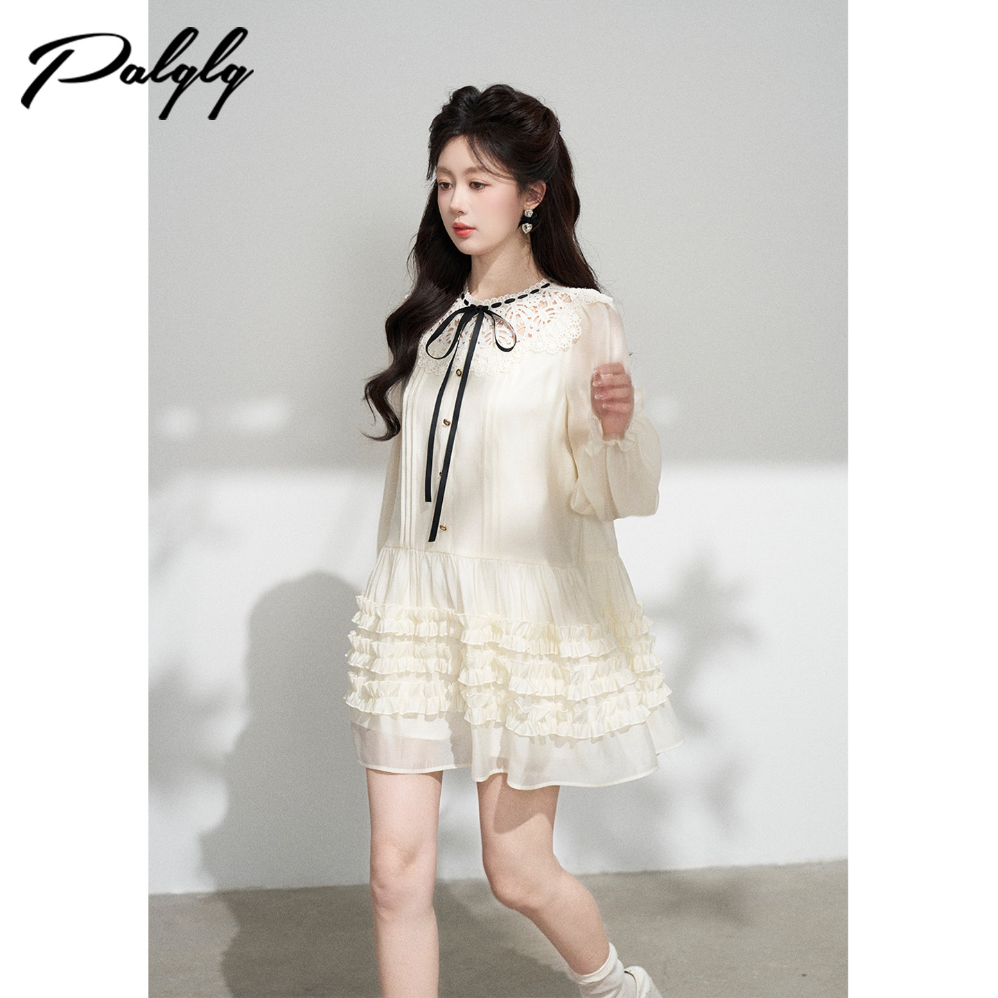 Palglg设计感小众杏色蕾丝连衣裙女春季法式甜美木耳边宽松直筒裙