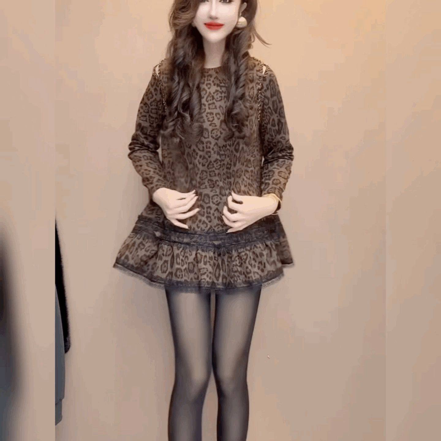 法式荷叶边打底裙漏肩宽松小红黑裙中长蕾丝花边圆领豹纹连衣裙女