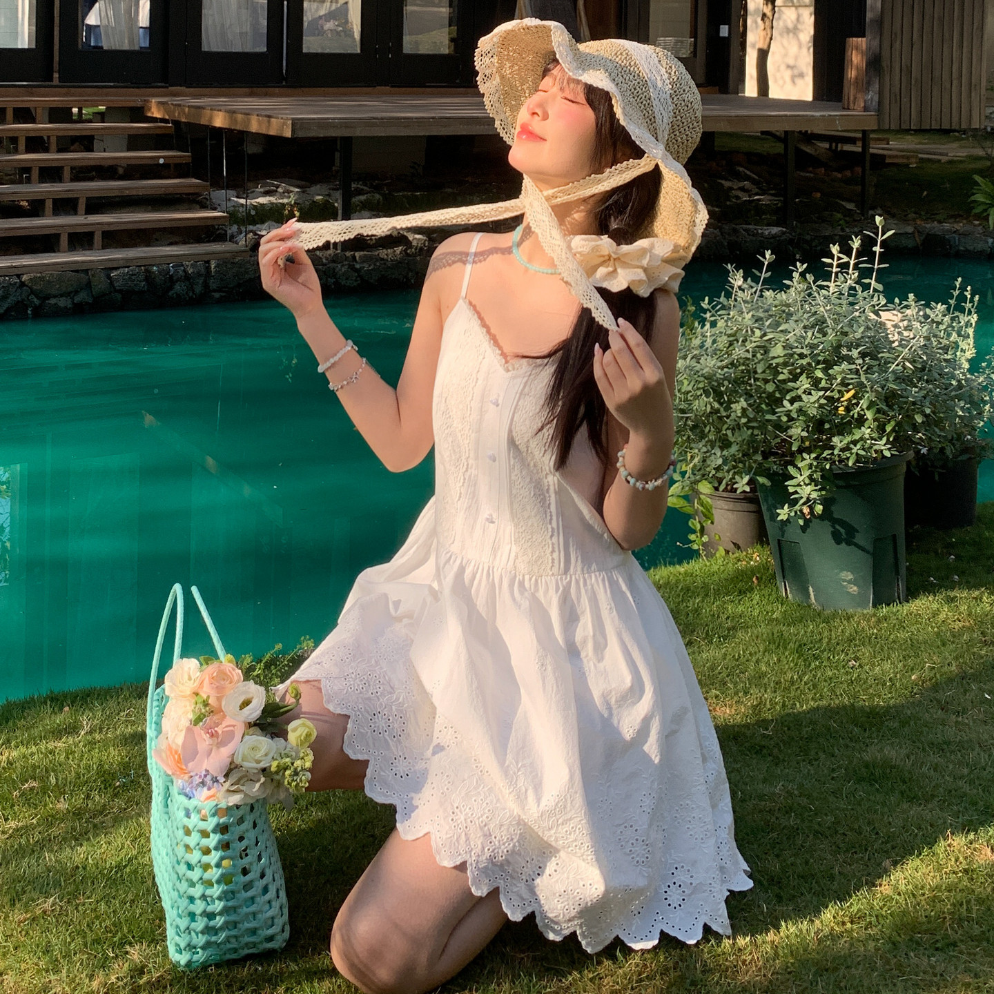 今屿花花连衣裙2025新款女夏季白色蕾丝吊带裙宽松无袖蛋糕裙雪纺