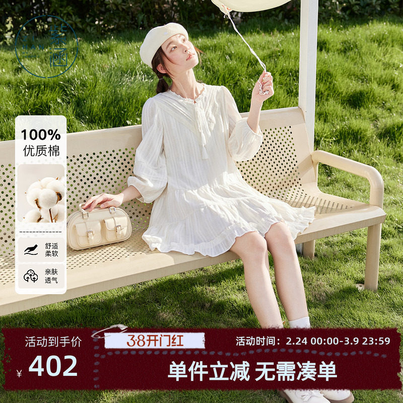 森女部落甜美风蕾丝娃娃领纯棉长袖连衣裙女2026新款宽松百搭春款