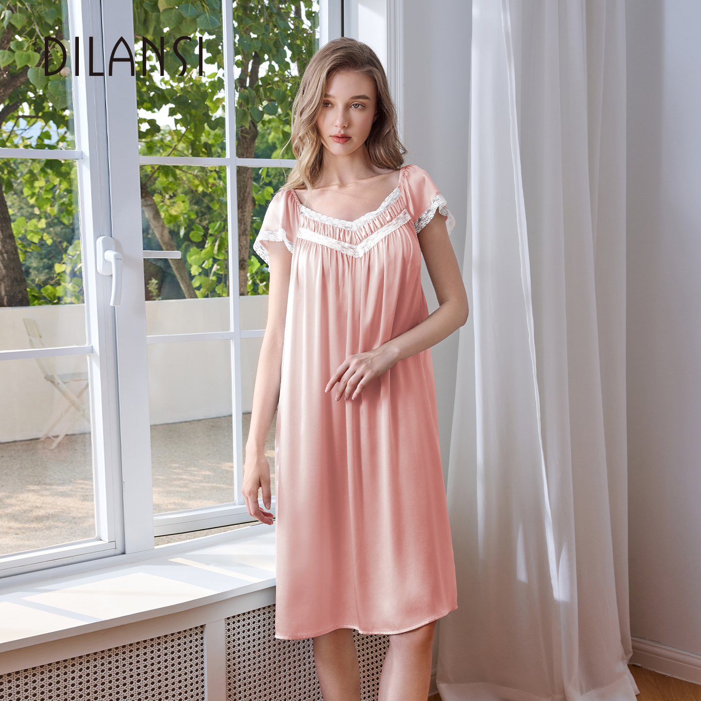 狄兰丝重磅真丝睡衣女100%桑蚕丝睡裙衣家居服睡衣女长款丝绸睡袍
