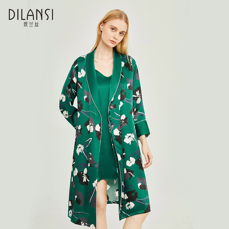 狄兰丝真丝睡袍女秋季新款100%桑蚕丝两件套装睡裙性感家居服睡衣