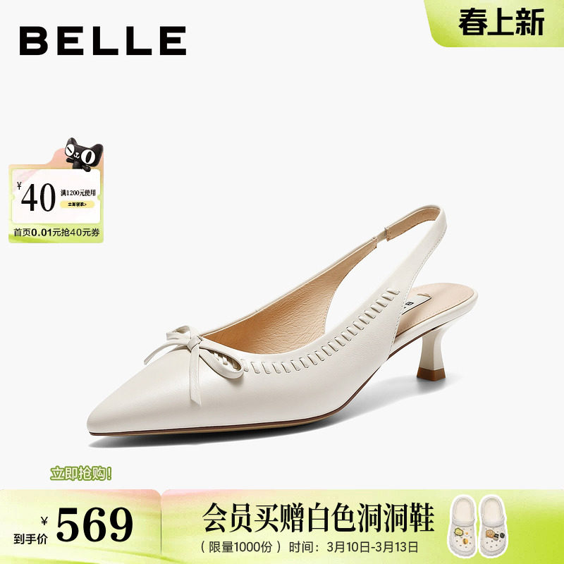 百丽气质羊皮高跟包头后空凉鞋女26夏新商场款蝴蝶结细跟BJB31B