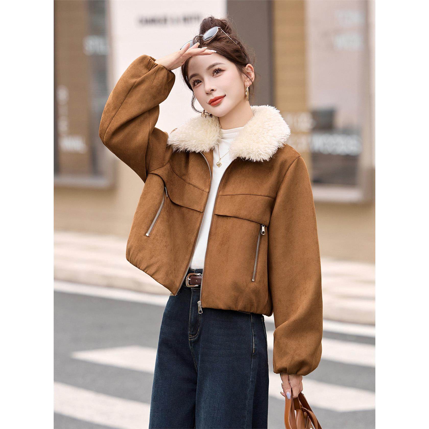 2025冬季仿鹿皮绒皮毛一体短外套女欧货高级感加绒加厚羊羔毛上衣