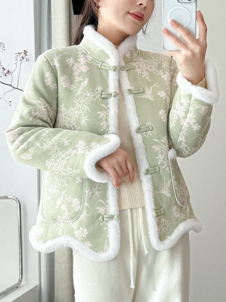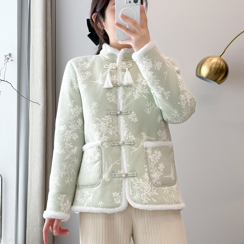 中式东北大花棉袄女冬季新款民族风加绒盘扣仿鹿皮绒棉衣棉服外套