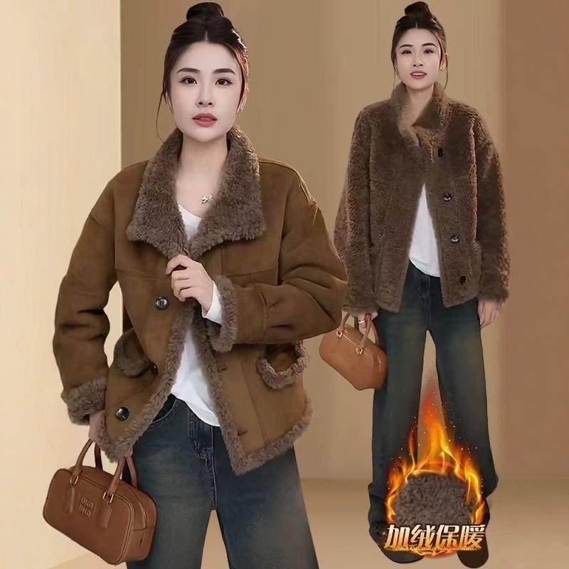 2025秋冬爆款鹿皮绒加绒羊羔毛外套女小个子皮毛一体保暖加厚上衣