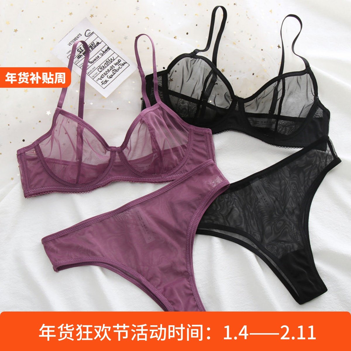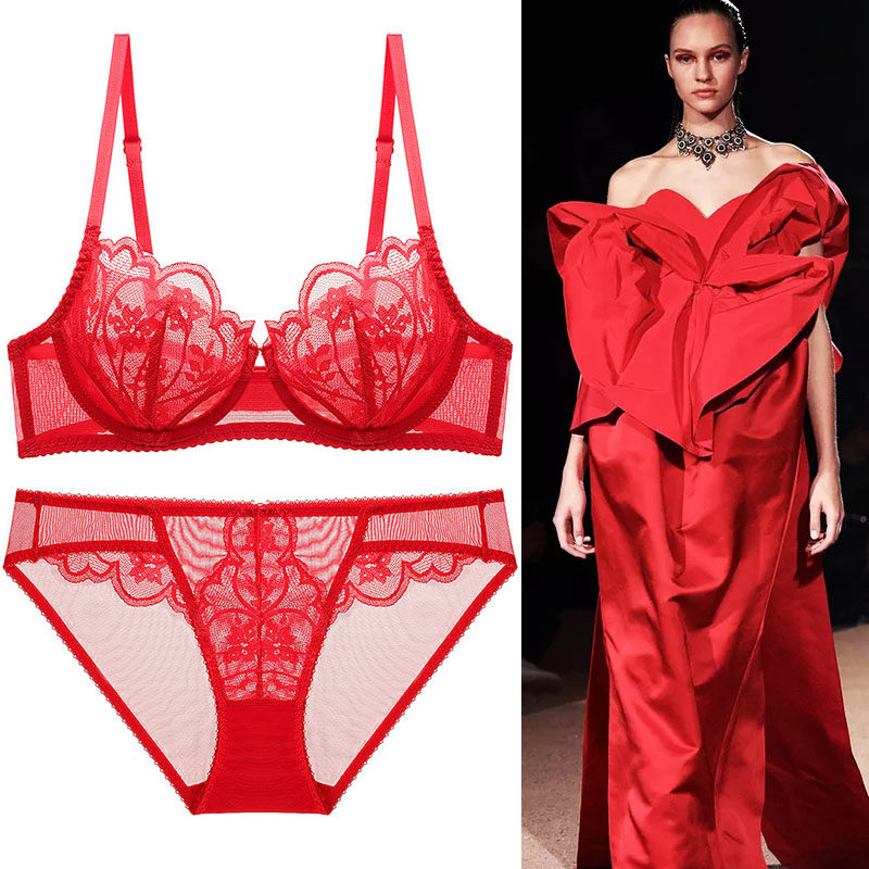 欧美超薄款内衣套装性感蕾丝网纱聚拢胸罩大胸显小文胸本命年红女